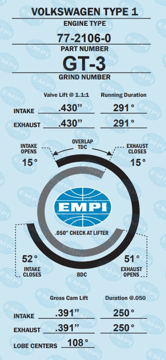 - EMPI GT Series nokkenas, vervaardigd uit volledig nieuwe, gekoelde gietijzeren blokken. EMPI GT Series nokkenassen zijn verkrijgbaar in (7) verschillende specificaties voor een breed scala aan motorprestaties, van mild straatgebruik tot racen. Alle GT Series nokkenassen zijn geparkeriseerd voor een probleemloze inloop en hebben direct na installatie de juiste speling voor een grotere slag, voor maximale waarde. Nieuwe Grade 8 bouten en moeren, timingkaart en montagevet zijn inbegrepen.
